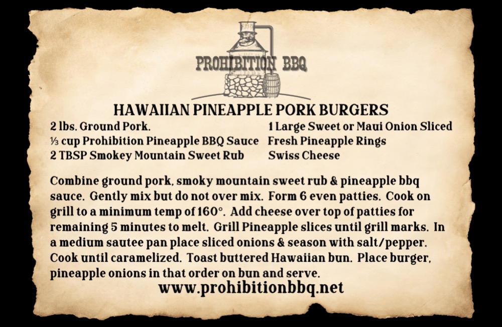 Juicy pork burgers infused with the sweet and savory flavors of Prohibition Pineapple BBQ Sauce and Smokey Mountain Sweet Rub. Topped with caramelized onions, grilled pineapple, and Swiss cheese, these burgers deliver a tropical twist with every bite.