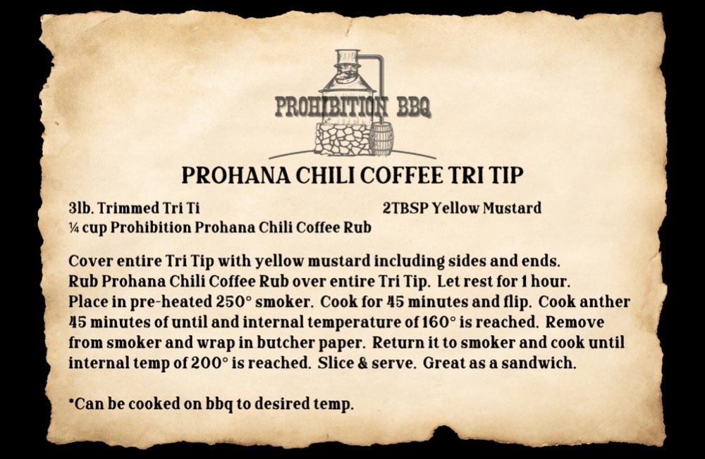 This bold and flavorful tri-tip is seasoned with Prohibition’s Prohana Chili Coffee Rub, adding a smoky, spicy kick with hints of coffee. Slow-smoked to tender perfection, it’s perfect for slicing and serving on its own or as a hearty sandwich.