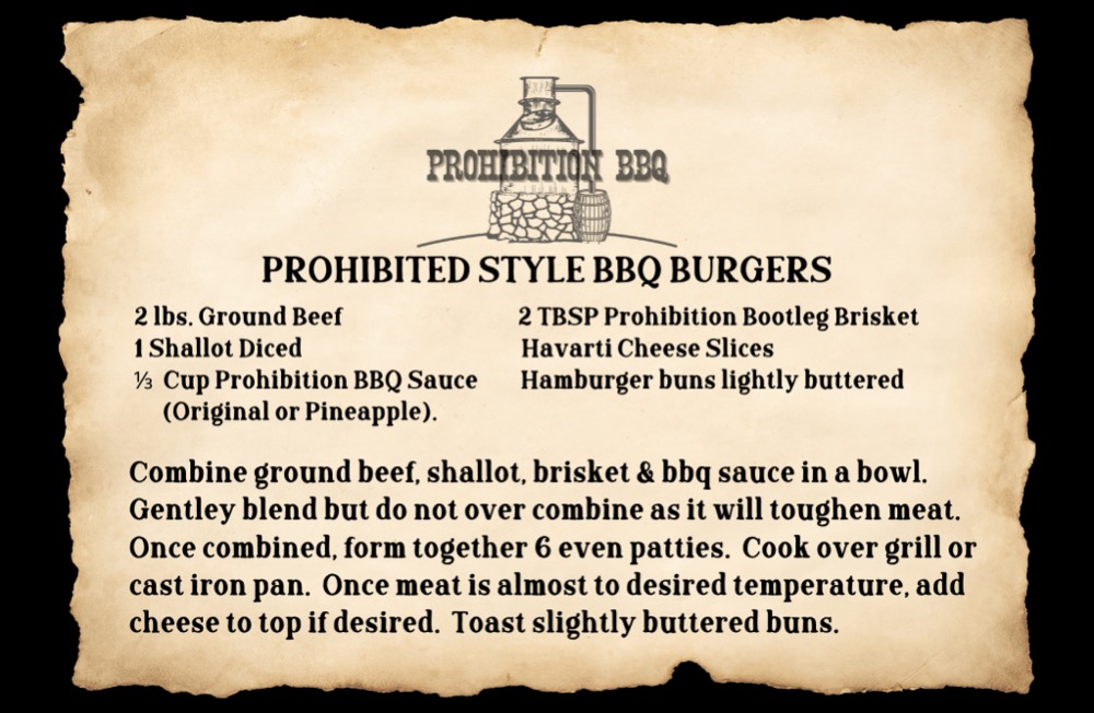 These juicy burgers combine ground beef, diced shallots, brisket, and Prohibition BBQ Sauce for a smoky, savory bite. Topped with melted Havarti cheese and served on toasted, buttery buns, they’re an irresistible BBQ favorite.